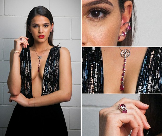 As joias são de marca nacional e custam, ao todo, R$ 85 mil. O colar usado pela atriz custa R$ 45 mil. Completando o seu look glamouroso, ela usou brincos e anel que custam, respectivamente, R$ 15 mil e R$ 23 mil.