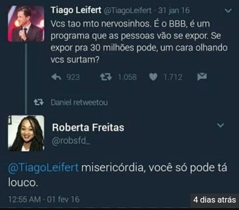 Agora, após a lista dos participantes ser divulgada, os internautas encontraram algo curioso no perfil de Roberta. “Vocês estão muito nervosinhos. É o BBB, é um programa que as pessoas vão se expor. Se expor para 30 milhões pode, um cara olhando vocês surtam?”, disse Leifert na época. E Roberta respondeu: “Misericórdia, você só pode estar louco”.