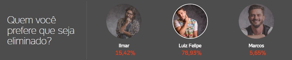 Luiz Felipe vem sofrendo alta rejeição há dias nas redes sociais. Já Marcos é o favorito desde o início da edição. Ilmar é aliado de Marcos. De acordo com todas as enquetes, Luiz sai com a porcentagem alta. Já Marcos devem acabar com baixa porcentagem de votos.