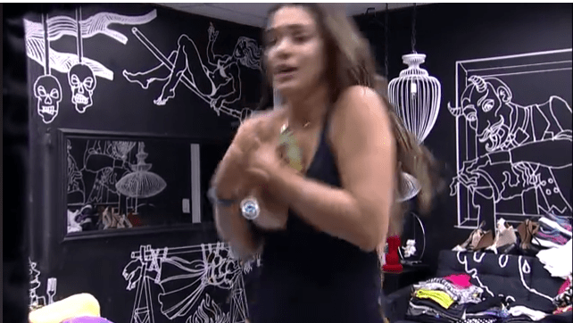 Depois de conversar com Pedro, Rômulo e Roberta, Vivian decidiu tomar banho. Com o biquíni molhado, a sister se dirigiu ao quarto preto, para se trocar.