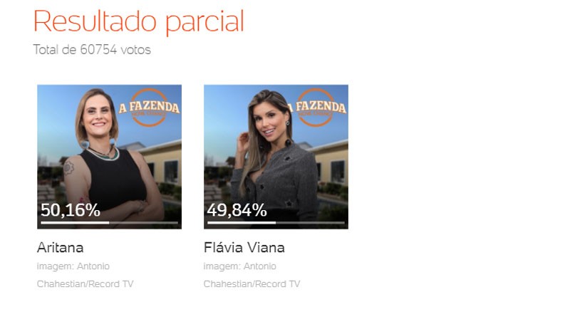 De acordo com a parcial da enquete UOL, Flávia é a favorita para continuar em A Fazenda. Mas por pouco. Aritana tem 50,16% e Flávia tem 49,84% da preferência do público para continuar na disputa, configurando um empate técnico.