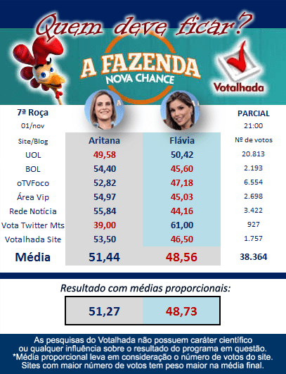 O site Votalhada sempre publica um apanhado das principais enquetes online sobre todas as roças, com o resultado de cada uma delas, a média geral e a média proporcional. Na parcial divulgada a 1h da manhã de quarta-feira (01), Flávia era a preferida do público para continuar em A Fazenda apenas no UOL e na enquete do Twitter do Votalhada.