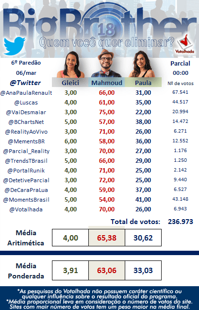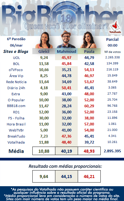 Já entre Mahmoud e Paula a disputa está mais acirrada. Enquanto na maioria das enquetes de sites e jornais Paula é a favorita para ser eliminada, Mahmoud é o mais votado nas enquetes do Twitter. Confira o resultado parcial das principais enquetes do paredão do BBB 18 abaixo.