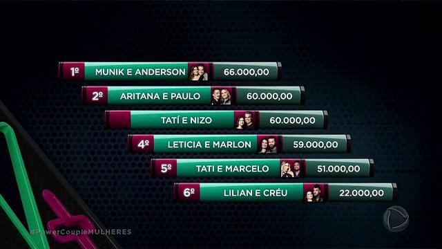 Letícia, Tatí, Munik, Tati Minerato e Aritana conseguiram cumprir a prova. A única que não conseguiu cumprir a Prova das Mulheres do Power Couple Brasil foi Lilian, que não conseguiu pegar nenhuma bola. Lilian e Créu, Tati Minerato e Marcelo, Letícia e Marlon são os últimos três lugares do ranking após a prova.