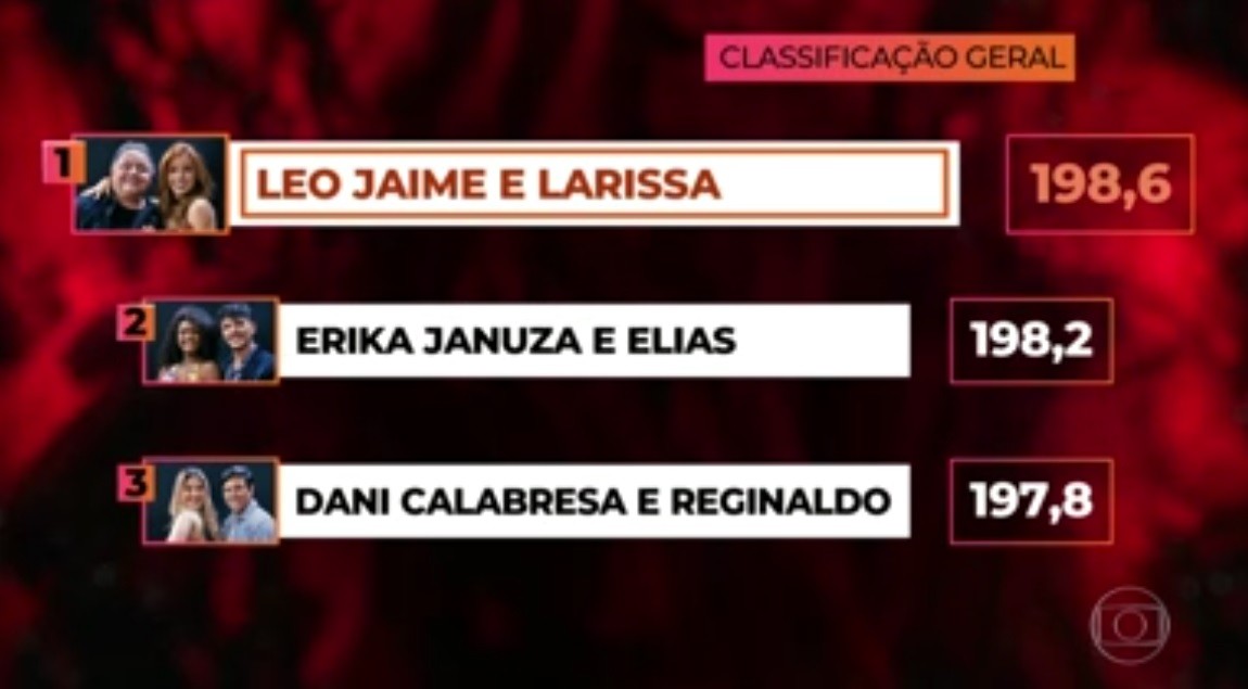 A ordem das apresentações já foi definida. O sorteio foi feito com a repórter Sthefany Vidal. Erika Januza será a primeirra a se apresentar, seguida por Dani Calabresa e por Leo Jaime, respectivamente. Os ritmos da decisão serão tango e valsa. Os detalhes dos figurinos já foram revelados pelo GShow. Os votos para o seu favorito podem ser dados no GShow, clicando aqui.