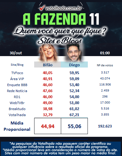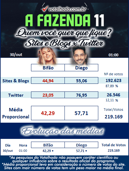 Nas enquetes do Twitter, Diego aparece com ainda mais vantagem. De acordo com o resultado parcial calculado pelo site Votalhada, Diego é preferido de 76,95% do Twitter para vencer a roça. De acordo com a média proporcional dos sites e Twitter, calculada pelo Votalhada, Diego é o preferido de 57,71% e Bifão, de 42,29%. Após as primeiras horas de enquetes, elas acumulam pouco mais de 219 mil votos.