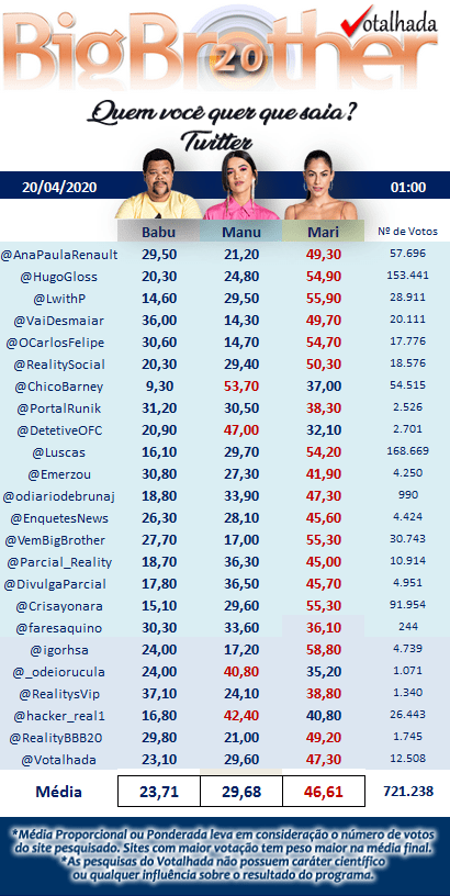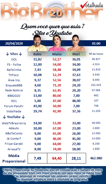 Na média das enquetes de sites e blogs, Manu tem 64,40% dos votos, contra 28,11% de Mari e 7,49% de Babu. São, ao todo, mais de 460 mil votos. Na média do Twitter, Mari tem 46,61% dos votos, contra 29,68% de Manu e 23,71% de Babu. São, ao todo, mais de 720 mil votos.