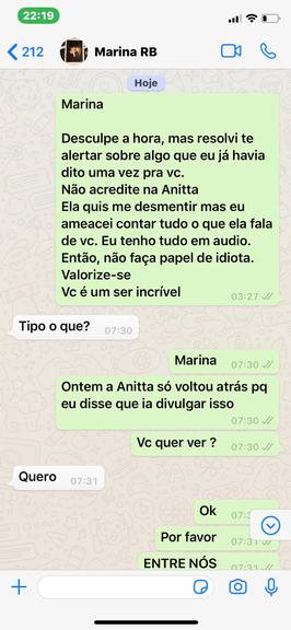 Nas mensagens publicadas por Leo Dias, o jornalista fala para a atriz sobre mensagens que recebeu de Anitta na época em que Marina era vítima de rumores de traição nos bastidores da novela O Sétimo Guardião. “Desculpe a hora, mas resolvi te alertar sobre algo que eu já havia dito uma vez pra você. Não acredite na Anitta. Ela quis me desmentir, mas eu ameacei contar tudo o que ela fala de você. Eu tenho tudo em áudio. Então, não faça papel de idiota. Valorize-se. Você é um ser incrível”, disse o jornalista, em print divulgado por ele mesmo.