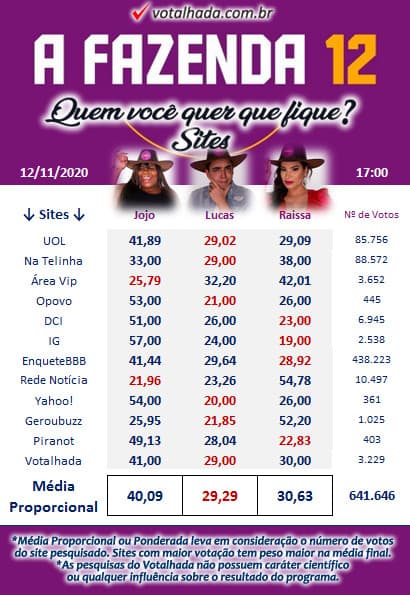 Na média proporcional de todas as principais enquetes online, a disputa também aparece acirrada entre Lucas e Raissa. Jojo é a preferida de 40,09% para continuar em A Fazenda. Raissa tem 30,63% dos votos e Lucas tem 29,29%. As principais enquetes online somam mais de 640 mil votos.