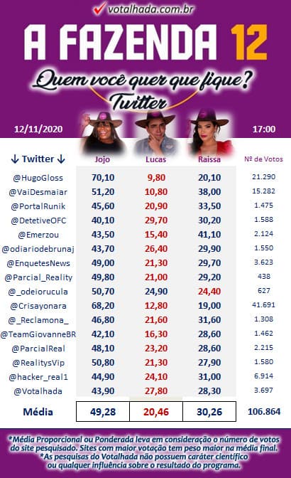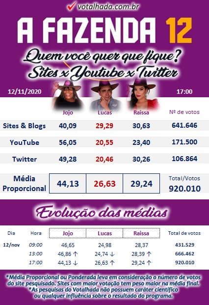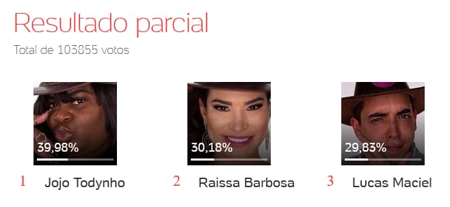 Na média proporcional geral, em que o blog Votalhada calcula votos de sites, blogs, canais do Youtube e Twitter, Jojo tem 44,13% dos mais de 920 mil votos. Raissa tem 29,24% e Lucas, 26,63%.