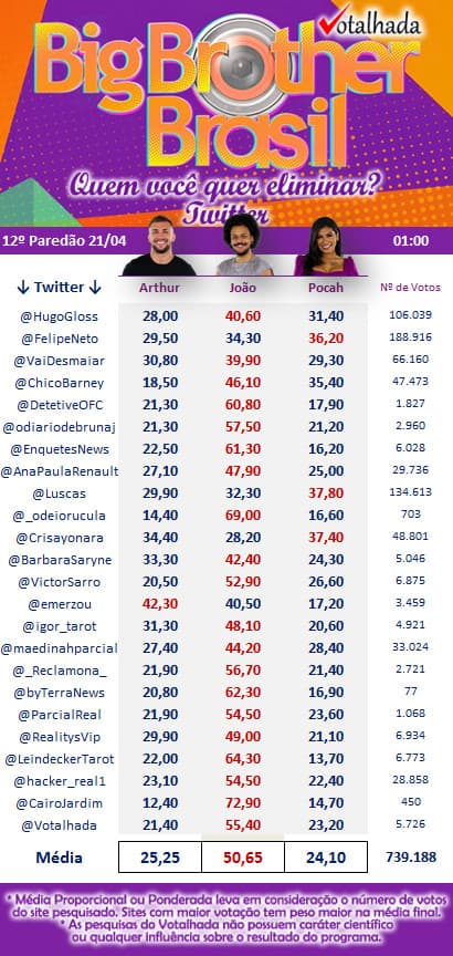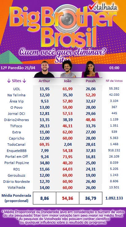 As enquetes dos principais sites e blogs já acumulam mais de 1 milhão de votos. Destes, 54,36% são para João, enquanto 36,79% são para Pocah e 8,86% são para Arthur. No Twitter, a média de votos de João é ainda maior em cada enquete. Ele tem média de 50,65% dos mais de 700 mil votos na rede social, contra 25,25% de Arthur e 24,10% de Pocah.