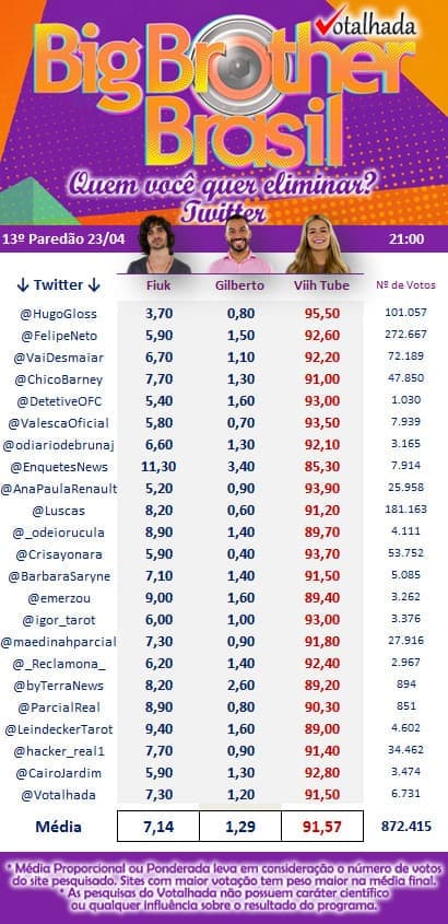 No Twitter, Viih Tube também tem rejeição nas enquetes, com média de 91,57% dos mais de 870 mil votos. Na média geral, calculada a partir de cada enquete online, a youtuber tem média de 93,73% dos mais de 5,8 milhões de votos e deve ser a eliminada de domingo (25) do BBB 21, com alta porcentagem. Os votos devem ser dados no GShow.