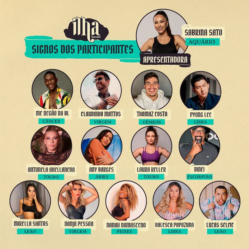 O programa é apresentado por Sabrina Sato. Veja abaixo o signo de cada participante.