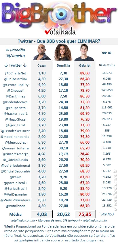 Já no Twitter, Gabriel é o favorito dos internautas para ser eliminado. Ele tem média de 75,25% dos mais de 500 mil votos, contra 20,62% para Domitila e 4,03% para Cezar. Na média geral, calculada pelo Votalhada e com resultados de enquetes de sites, Twitter, Youtube e Telegram, Gabriel é apontado como segundo eliminado do BBB 23. Ele tem média de 47,53% dos mais de 1,7 milhão de votos, contra 40,94% para Domitila e 11,53% para Cezar Black.