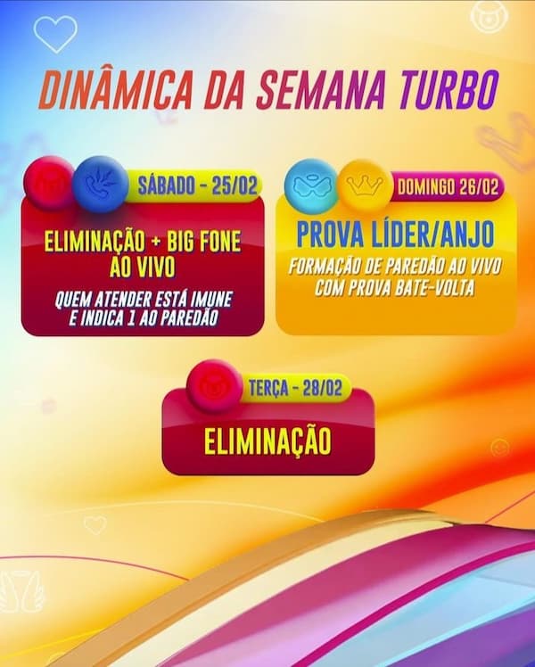 Ainda neste sábado (25), o Big Fone irá tocar mais uma vez. Dessa vez, quem atender estará imune ao próximo paredão e terá que indicar alguém. No domingo (26), acontecerá a Prova do Líder e Prova do Anjo. A formação do paredão também acontece domingo, dessa vez com Prova Bate-Volta. Por fim, a Semana Turbo do BBB 23 se encerra terça-feira (28), com eliminação ao vivo.
